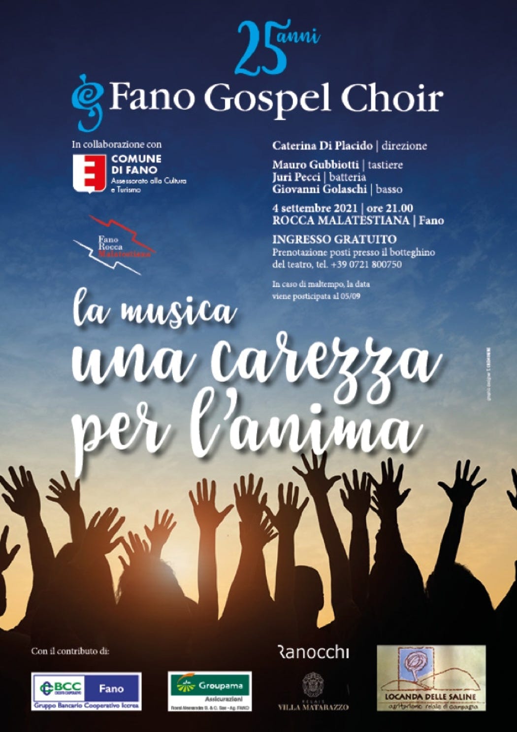 Il Fano Gospel Choir festeggia i 25 Anni di passione per la musica gospel, con il concerto LA MUSICA, UNA CAREZZA PER L’ANIMA che si terrà sabato 4 settembre alla Rocca Malatestiana di Fano (in caso di maltempo, verrà posticipata al 5 settembre), in collaborazione con Il Comune di Fano, l’Assessorato alla Cultura e La Rocca Malatestiana.